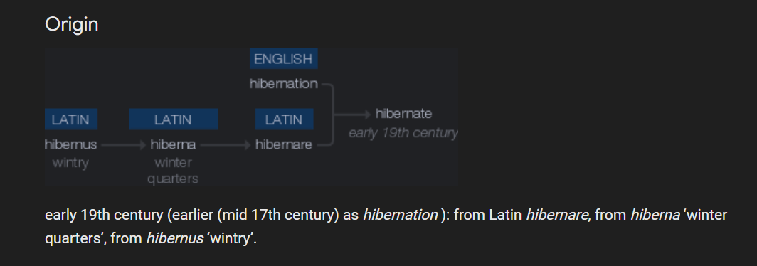 The term Hibernate relates to winter. Hibernate is meant to describe a deep sleep, which is often mistaken for a deep torpor, but that’s nuance semantics. Hiber relating to Winter or wintry;
