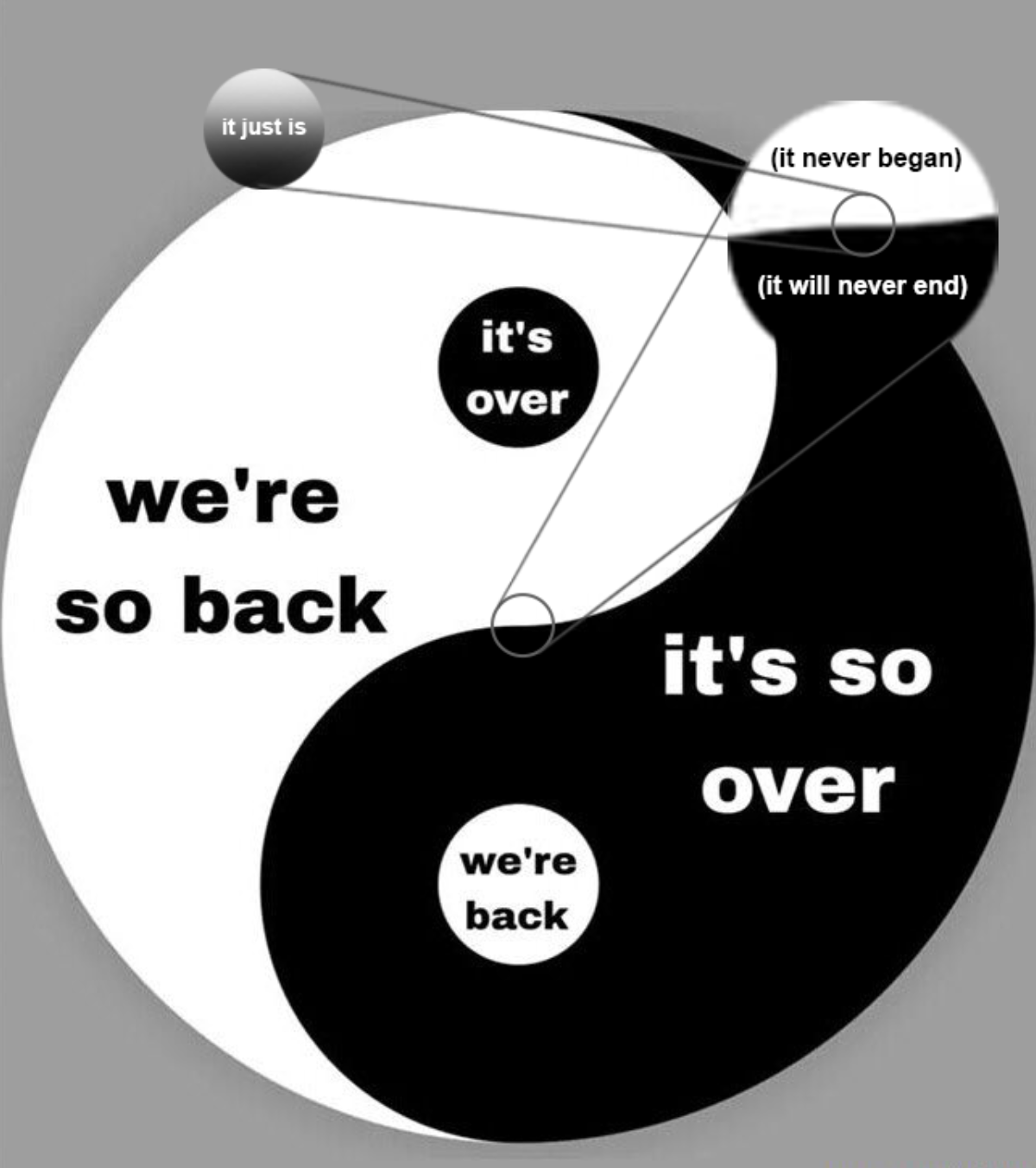 This meme has a dance of philosophy between existentialism and nihilism, the Dao, the duality of it working out and it not working out. Memes, are like art, each person gets their own subjective perspective of it based on how they see it (and you might see this meme differently). I reference philosophy because I see it’s Westernized takes and slang and language using English. As they say; It is what it is.